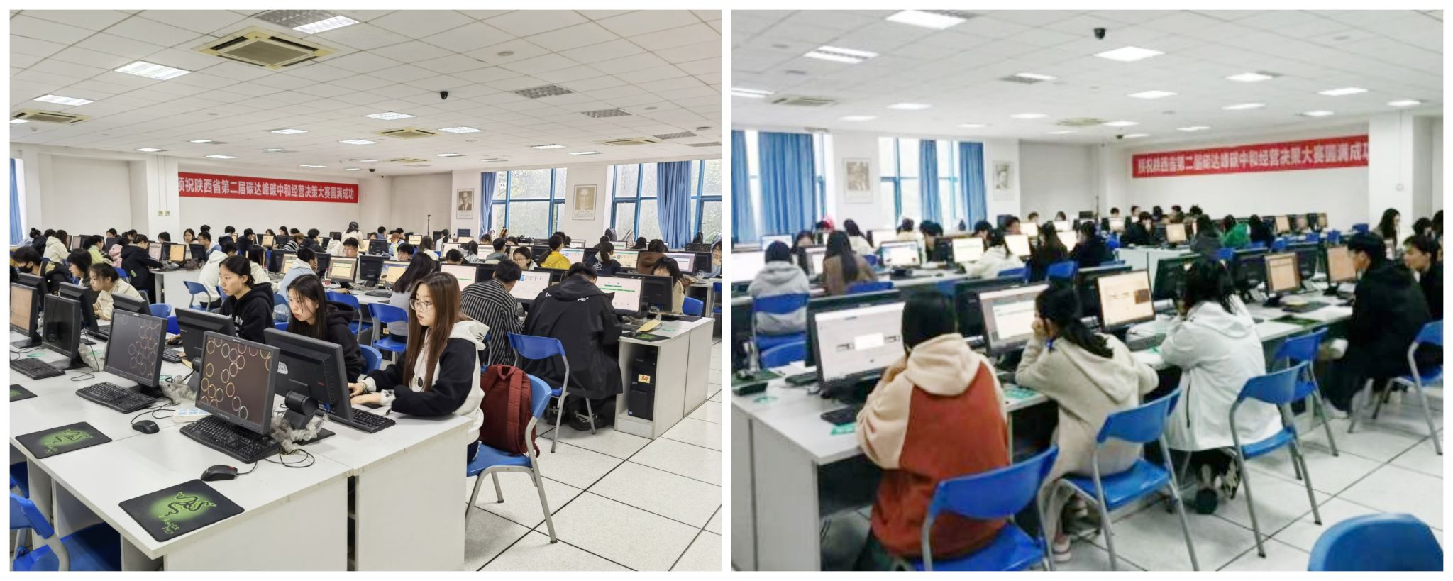 开幕式结束后,参赛选手以小组为单位,在学校计算机实验室进行比赛。各院校参赛代表队在5个小时紧张、激烈的经营对抗中,充分展现了团队协作与个人才华的完美结合,新思想、新理念、新技术的碰撞与融合,实现了对绿色低碳领域专业知识和技能的检验,并激发了继续加强在双碳领域学习和实践的兴趣。
