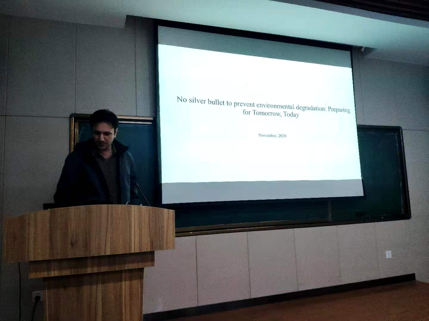 2020年11月20日,清华大学博士后,新加坡亚太科学中心研究顾问,西安邮电大学客座教授,Syed Abdul Rehman Khan博士应邀为我院师生做题为“No Silver Bullet for De-carbonization: Preparing for Tomorrow, Today”的报告。